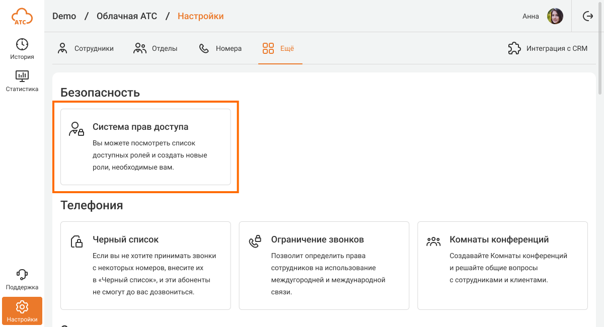 Чтобы посмотреть возможности ролей или изменить их, в настройках АТС перейдите на вкладку «Еще». В разделе «Безопасность» кликните на блок «Система прав доступа».