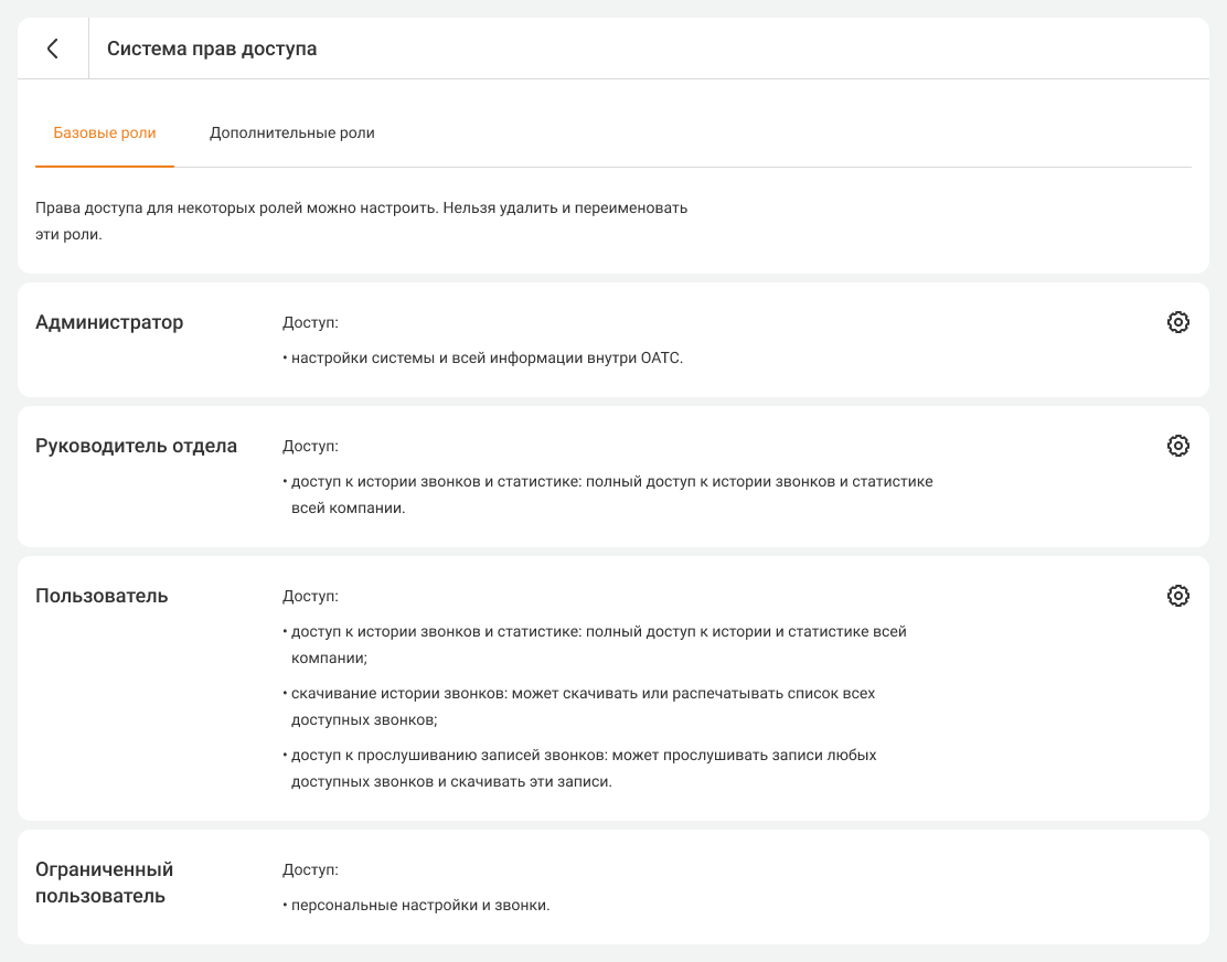 Каждая компания может сама решать, какие права доступа предоставлять рядовым сотрудникам, руководителям отделов и администраторам АТС. По умолчанию в АТС есть 4 уровня доступа: администратор, руководитель отдела, пользователь и ограниченный пользователь. Также можно настроить дополнительные роли, которые лучше подойдут для вашей компании.