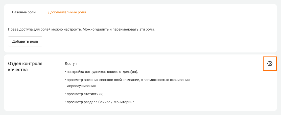 Также по умолчанию руководитель отдела имеет доступ к истории и статистике звонков своего отдела. Если хотите дать руководителю отдела доступ к истории и статистике по всей компании, нажмите на шестеренку рядом с этой ролью.