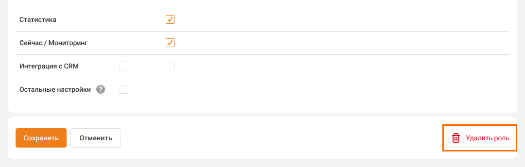 • Интеграция с CRM — можно настроить доступ для просмотра или редактирования настроек интеграций CRM.