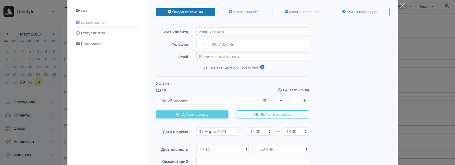 Возможно, в течение дня у вас открыто несколько вкладок. На вкладке Altegio количество необработанных входящих будет подсвечено красно-белой цифрой. Вы не пропустите ни одного клиента.Если вызов идет с неизвестного номера Вы можете выполнить одно из двух действий, просто кликнув на нужную строчку на всплывающей подсказке: Записать клиента на конкретную дату (сеанс массажа, посещение мастера, тренировка и т. д.). В карточке вы сразу сможете отметить контактные данные звонящего, вид услуги, длительность и т. д. Запись будет сохранена в календаре.