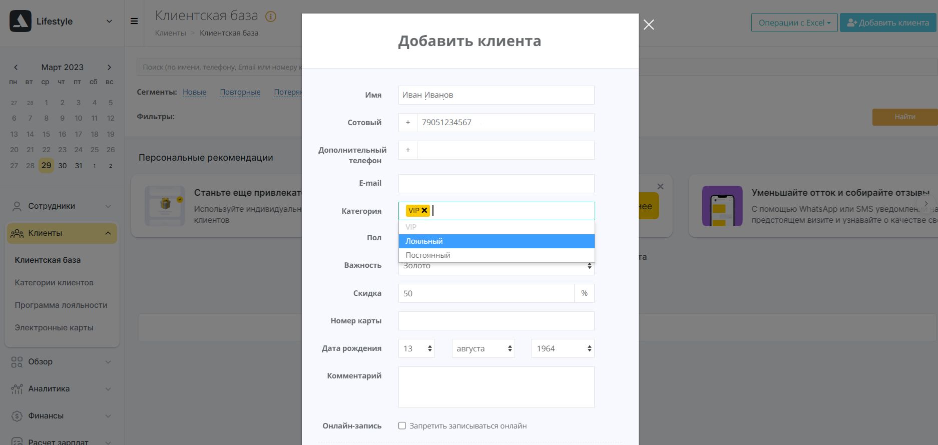 Добавить клиента в базу. При заполнении персональной карточки вы можете указать, помимо прочего, категорию звонящего (VIP, Лояльный, Постоянный) и его важность (Бронза, Серебро, Золото) и т. д. Контакт будет сохранен в разделе «Клиенты».