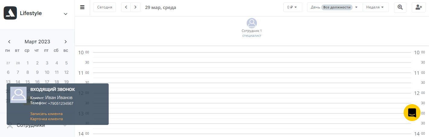 На всплывающей карточке вы увидите имя, фамилию и номер телефона звонящего. Вы сразу сможете поприветствовать его по имени, а также создать визит и записать клиента на событие или открыть карточку клиента, чтобы узнать о его статусе для компании, персональных скидках и т. п.
