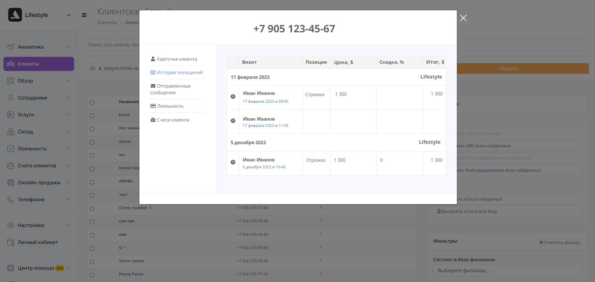 Кликните на имя в таблице. Вы попадете в персональную карточку клиента. Выберите «История посещений».