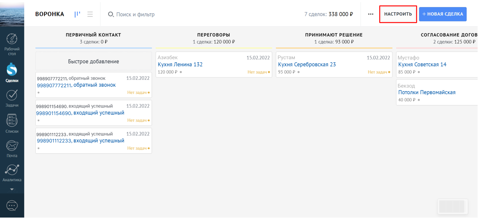 1. В интерфейсе amoCRM зайдите в раздел «Сделки». В правом верхнем углу нажмите «Настроить».