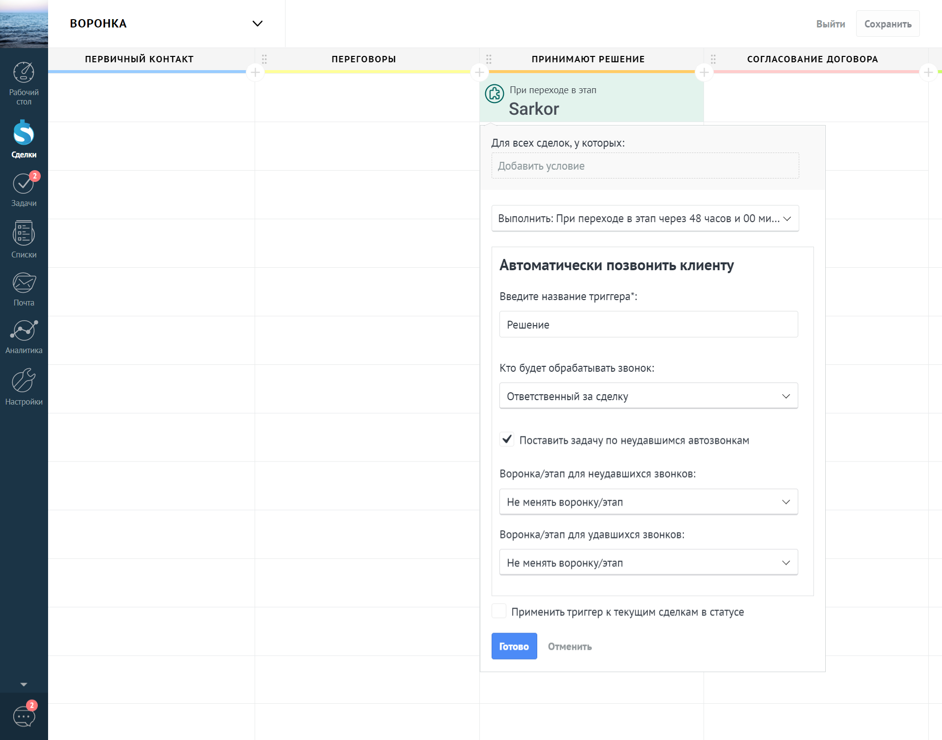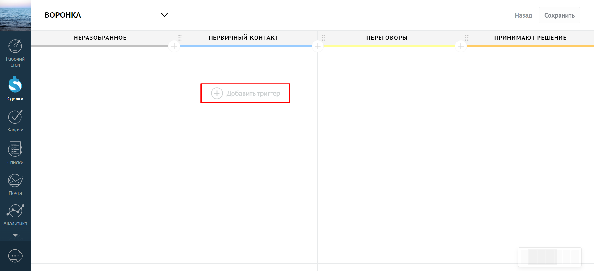 - какие изменения в сделке должны активировать работу триггера (например, переход в этап),