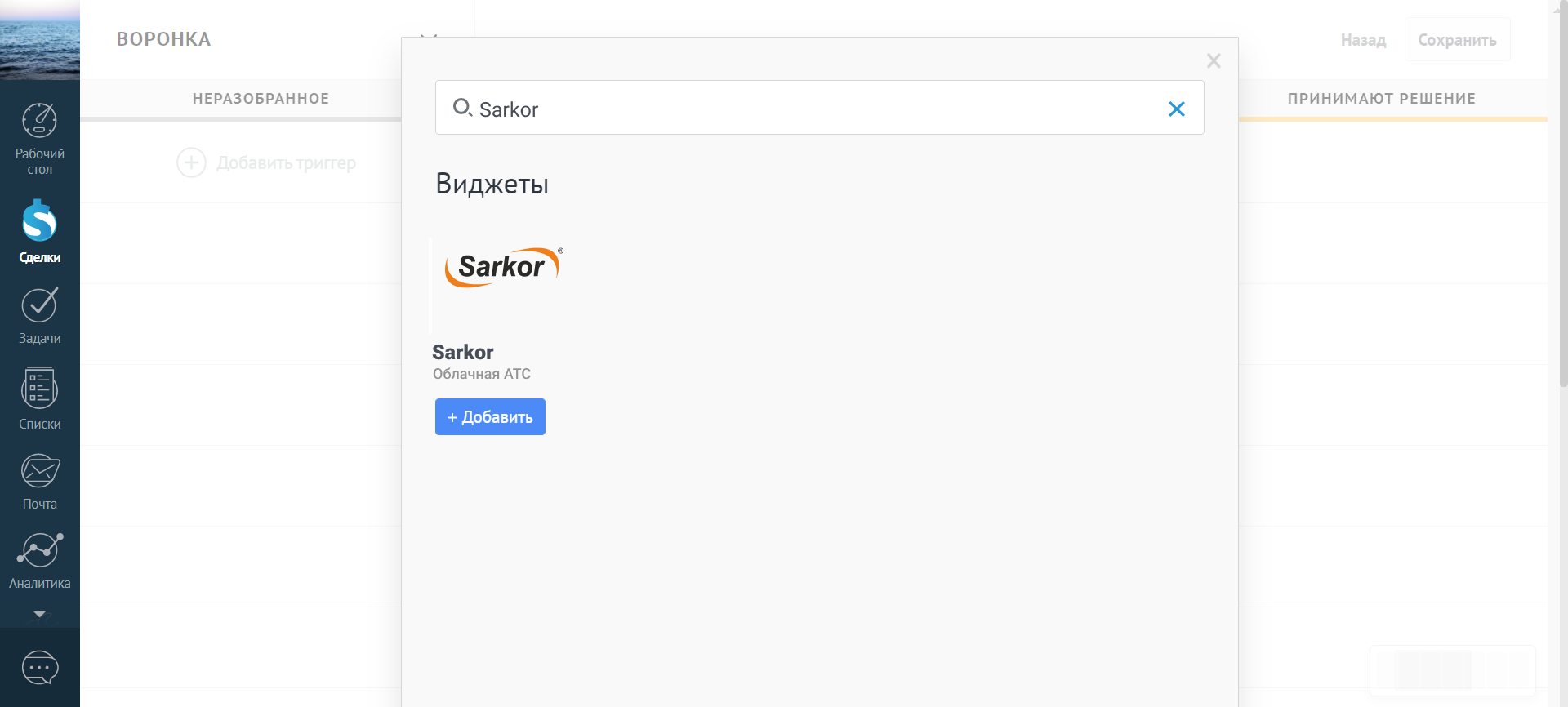 3. Выберите виджет Облачной АТС (для удобства воспользуйтесь поиском). Нажмите «Добавить».