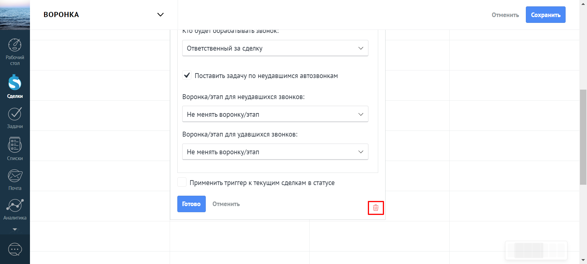 7. Если вы захотите, чтобы Облачная АТС перестала совершать автоматические звонки, просто удалите неактуальный триггер. Для этого в настройках воронки выберите нужный триггер и нажмите на корзину в правом нижнем углу окна настройки.