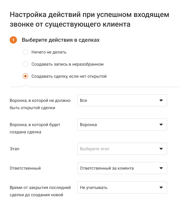 Иногда клиенты перезванивают после закрытия сделки в amoCRM — например, для уточнения деталей о заказе. По умолчанию после таких звонков появляются новые ненужные сделки.