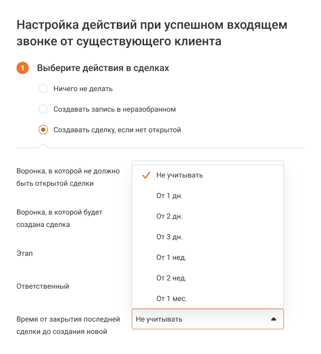 Чтобы не удалять дубли вручную, настройте период ожидания после закрытия сделки — если в это время позвонит тот же клиент, то дубль не появится в CRM.