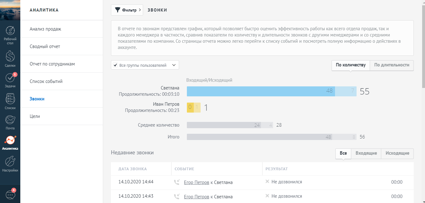 В разделе «Аналитика» вашей amoCRM вы можете увидеть историю звонков всего отдела продаж и каждого менеджера в отдельности, сравнить показатели по количеству и длительности звонков с другими менеджерами и со средними показателями по компании.