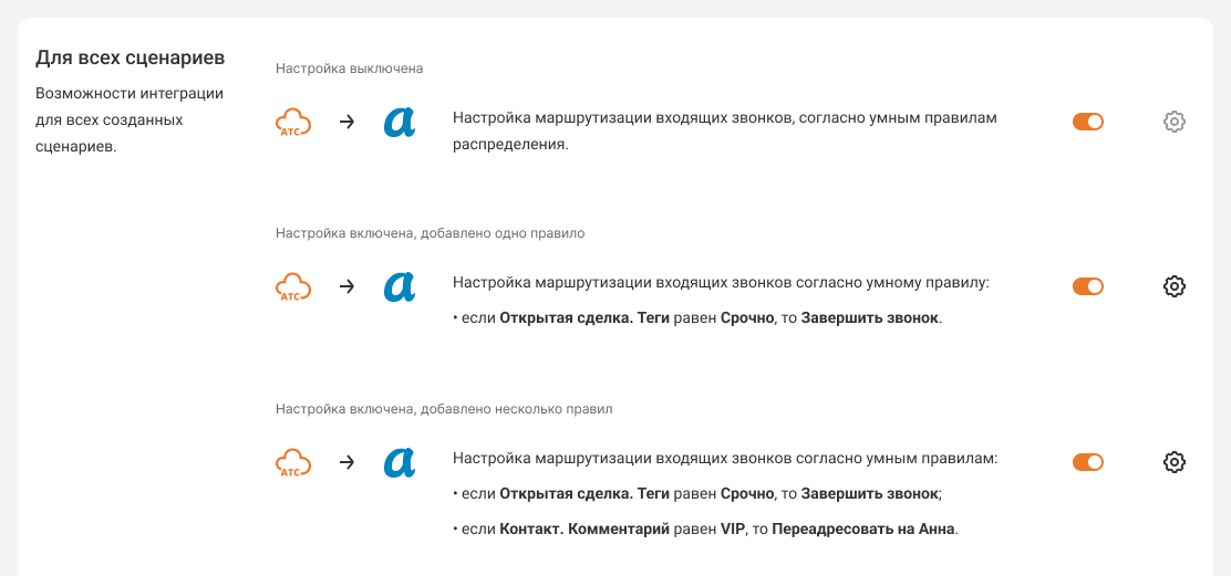Теги будут учитываться при умной маршрутизации входящих звонков. Система будет направлять вызовы определенным сотрудникам или отделам, ответственным за работу с клиентами с соответствующими метками. Чтобы маршрутизация заработала добавьте соответствующие правила в настройках сценария во вкладке «Интеграции с CRM» — «amoCRM» — «Настройка маршрутизации входящих звонков, согласно умным правилам распределения».