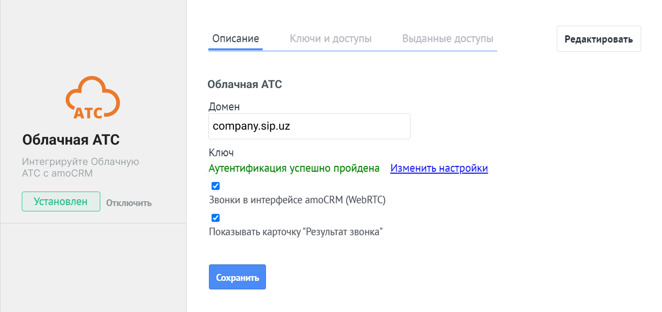 В amoCRM зайдите в раздел «Настройки» — «Интеграции» — «Облачная АТС», выберите «Звонки в интерфейсе amoCRM (WebRTC)» и «Показывать карточку «Результат звонка»».