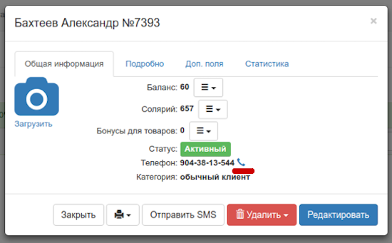 Для совершения звонка клиенту, откройте карточку клиента и нажмите на значок телефона рядом с его номером.