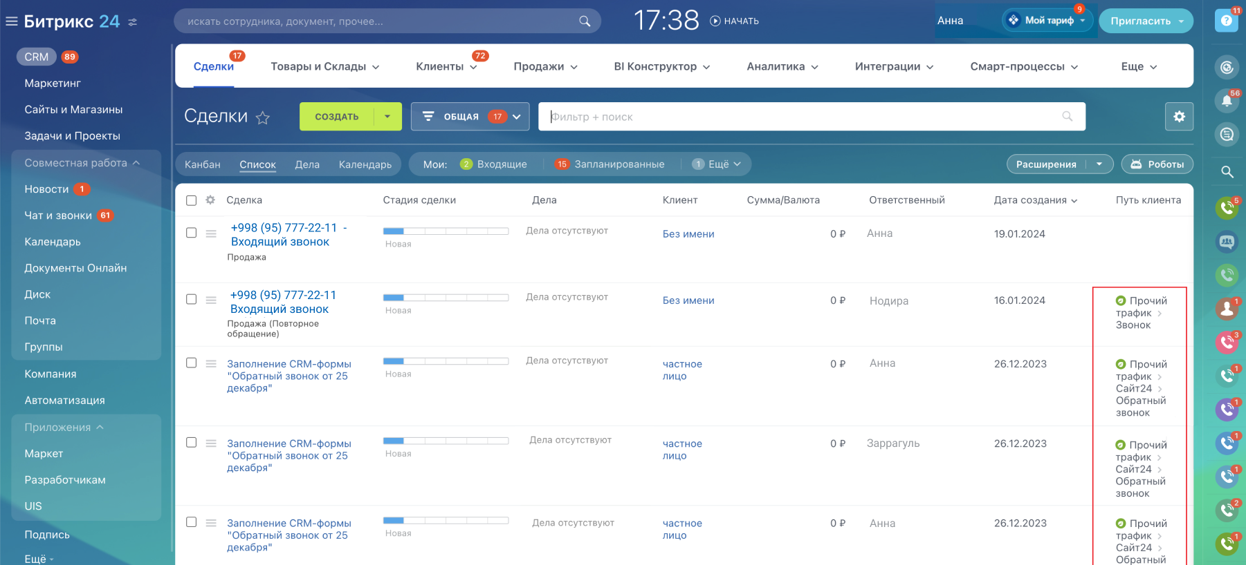 Если вы настроите интеграцию с АТС, вам станет доступна сквозная аналитика и коллтрекинг от Битрикс24. Вы сможете настроить источники трафика и связать с ними номера вашей АТС. При звонках клиентов на эти номера, данные о лидах и сделках с указанием источников трафика будут фиксироваться в отчетах Сквозной аналитики.