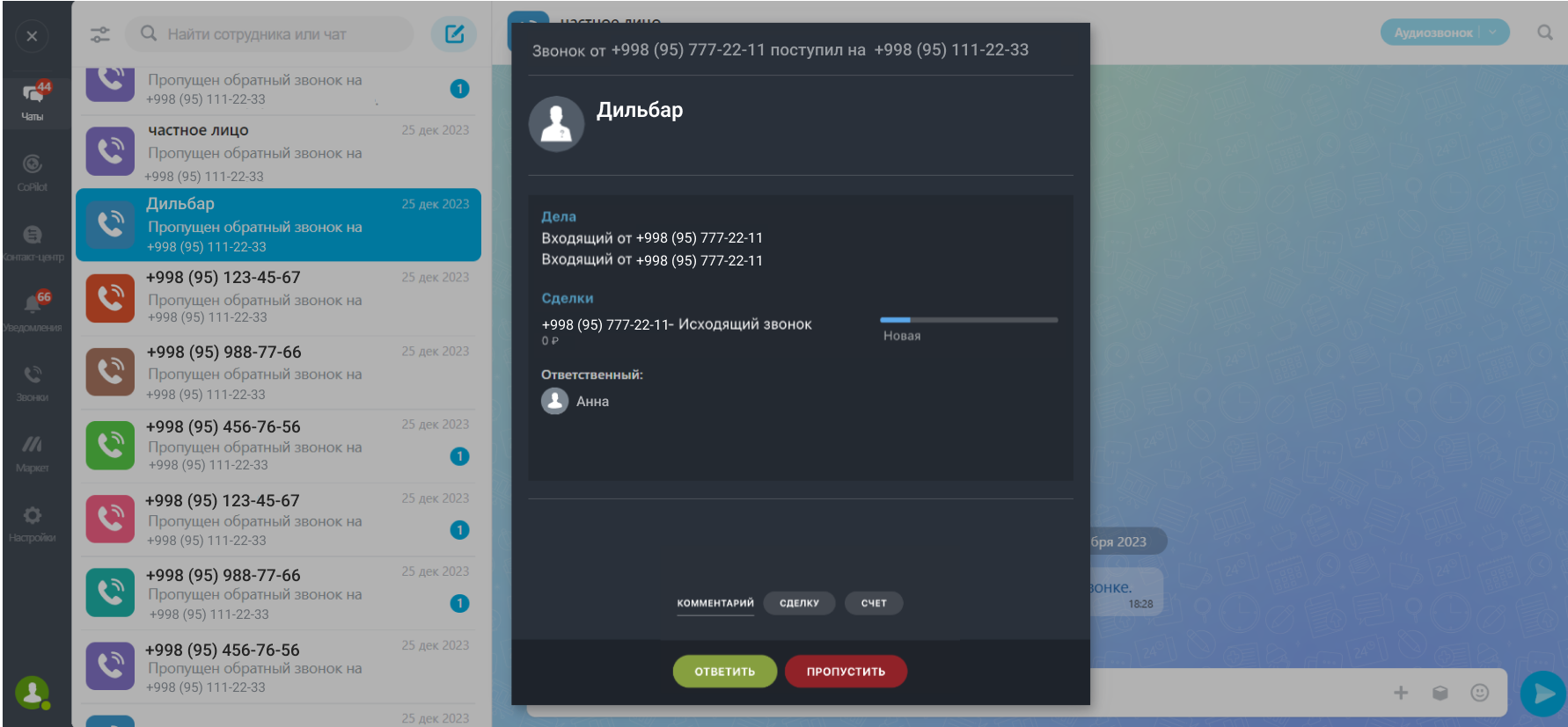 Ответив на звонок, сотрудник может сразу обратиться к клиенту по имени – это избавит позвонившего от необходимости представляться и пересказывать детали предыдущих этапов общения с вашей компанией. Кроме того, клиенту будет приятно, что его помнят, и это значительно повысит лояльность. Даже если вызов совершается с неизвестного номера, когда вы ответите на звонок, у вас будет возможность оставить комментарий, создать сделку и/или счет прямо во время разговора.