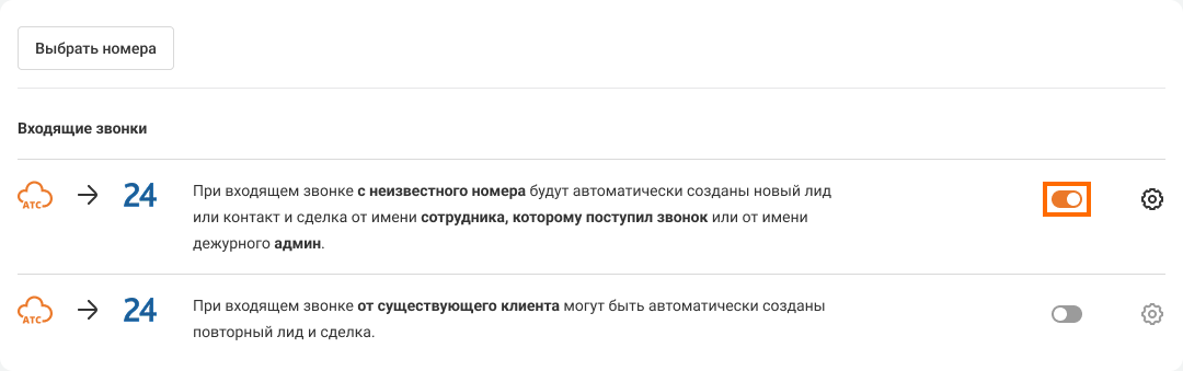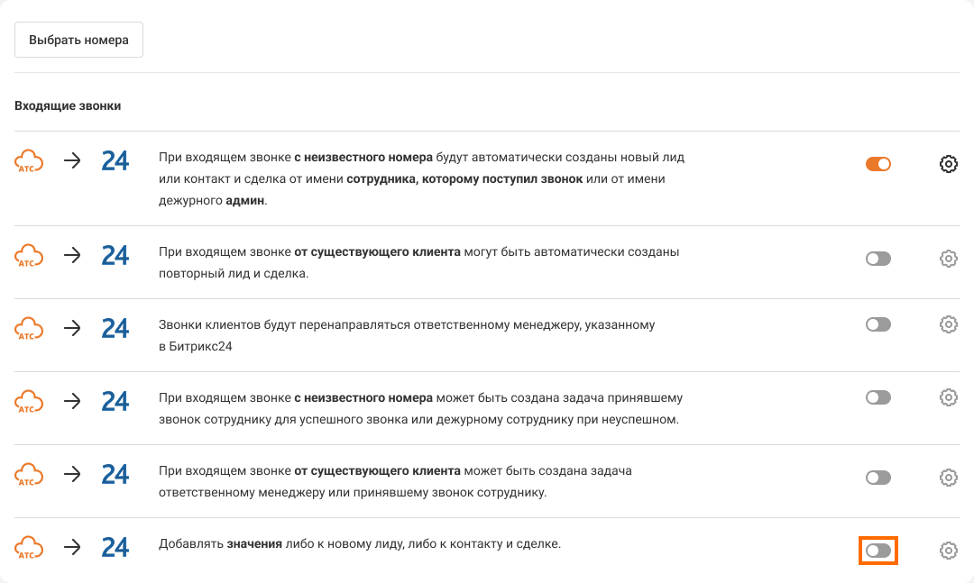 1. В интерфейсе АТС перейдите в: «Настройки» — «Интеграция с CRM» — «Интеграция с Битрикс24» — сценарии интеграции для входящих звонков. 2. Включите автоматическое создание лидов, контактов и сделок в интерфейсе АТС.