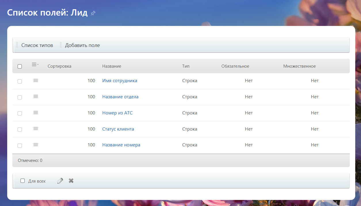 Из АТС можно дополнительно передавать пять типов данных. Для каждого типа нужно создать отдельное поле в Битрикс24.