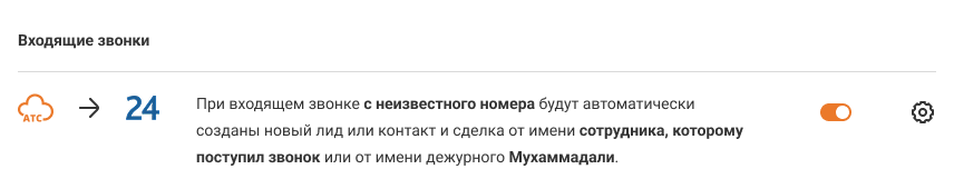 1. Чтобы при новом входящем или исходящем звонке в Битрикс24 автоматически создавался лид или сделка с контактом, нужно включить создание этих сущностей в АТС.
