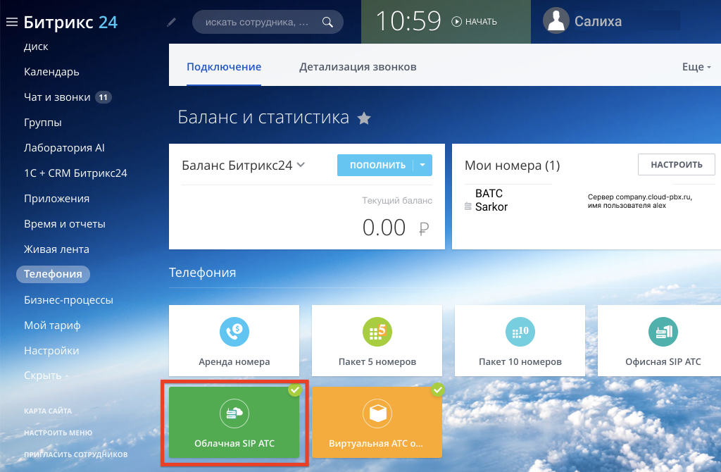 Зайдите в свой Битрикс24. Пройдите в разделы «Управление номерами» (в блоке «Телефония») – «Подключить SIP ATC» – «Подключить Облачную АТС».