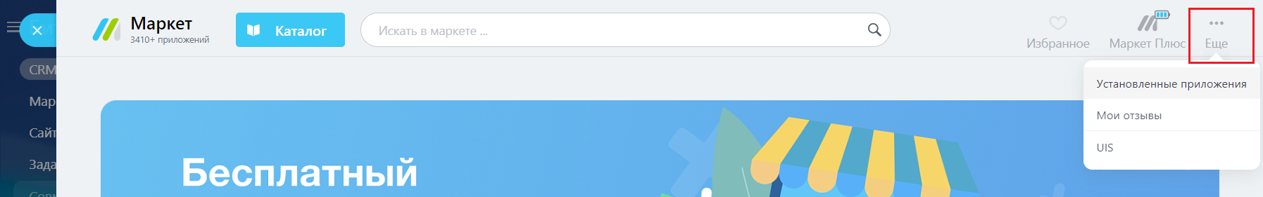 Авторизуйтесь в Битрикс24 и перейдите в раздел «Маркет». Найдите интеграцию с вашей АТС: либо нажмите на кнопку «Еще» – «Установленные приложения», либо введите название оператора в поисковую строку (например: sarkor).