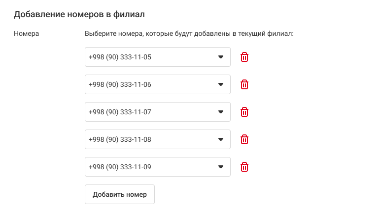 4. Для добавления еще одного номера нажмите на кнопку «Добавить номер». Чтобы удалить случайно добавленный номер, нажмите на корзину справа.
