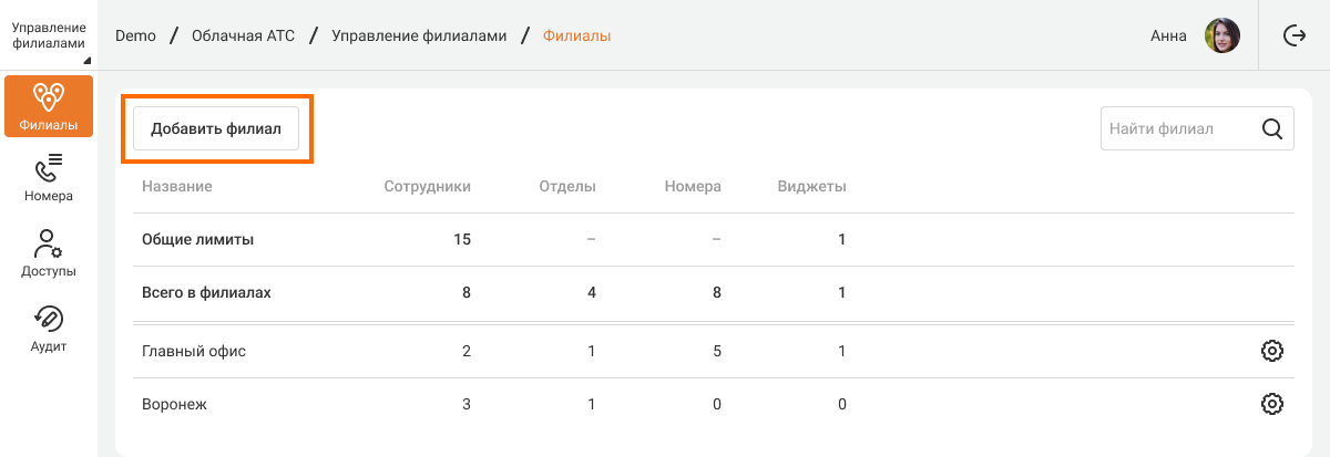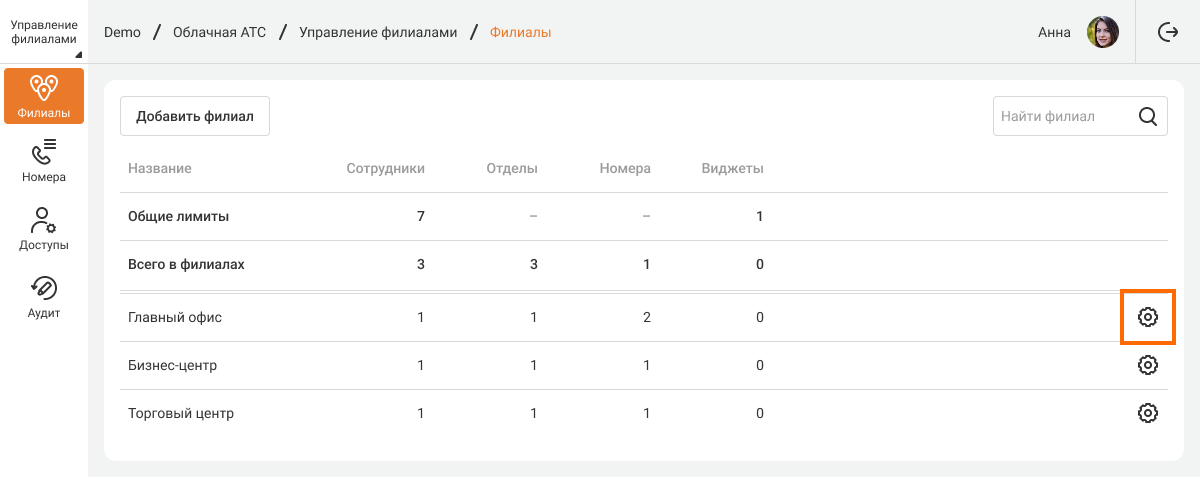 1. Чтобы перейти в настройки определенного филиала, нажмите на шестеренку в соответствующей строке.