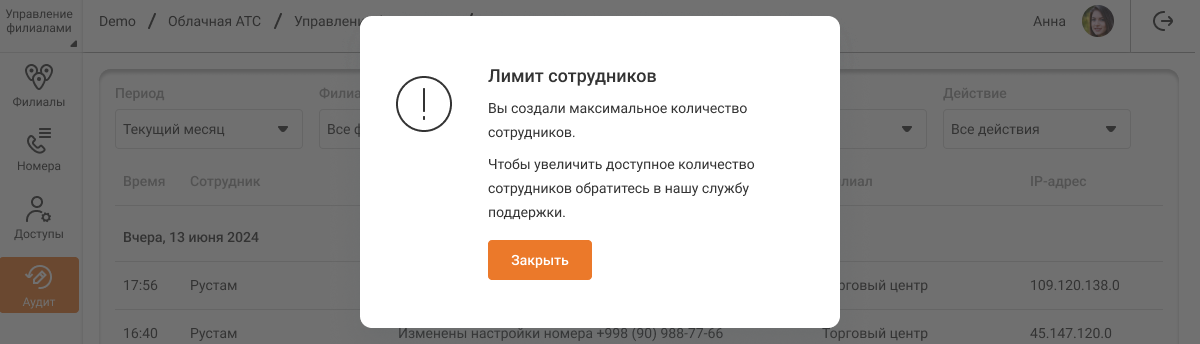 • Всего в филиалах: общее количество уже созданных сотрудников, отделов, номеров и виджетов во всех филиалах.