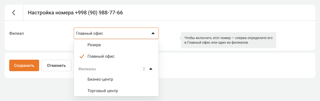 - Состояние – выключен или включен. Номер можно выключить в настройках номеров внутри филиала или в кабинете управления филиалами, если добавить его в резерв.
