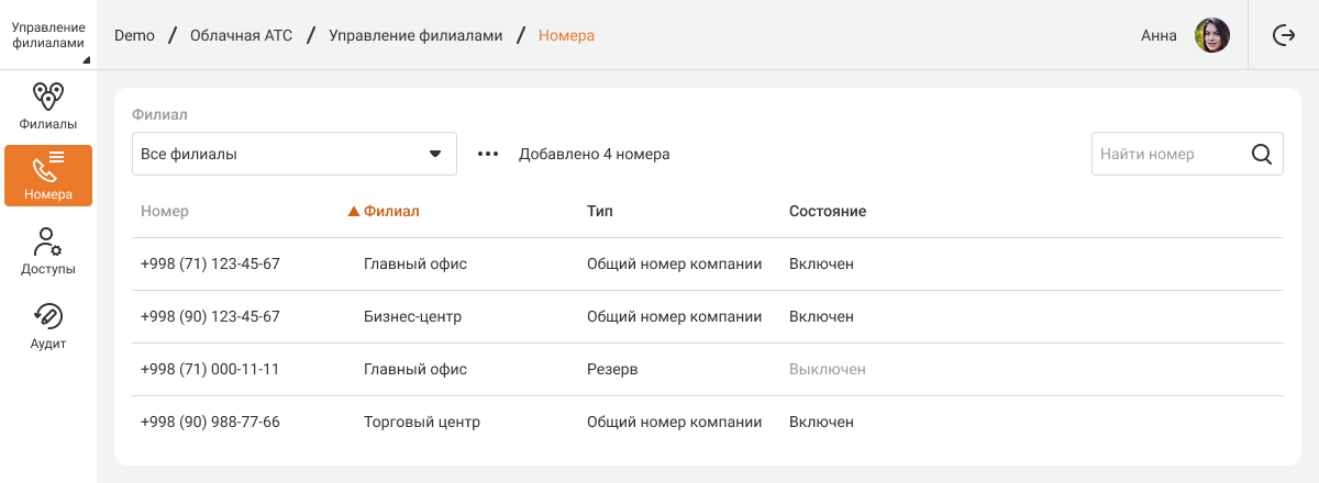 В кабинете управления филиалами есть раздел «Номера», где можно посмотреть сводные данные по всем номерам компании и распределить эти номера между подразделениями.