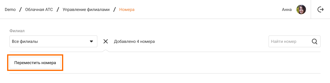 4. Нажмите на кнопку «Переместить». Теперь выбранные номера относятся к указанному филиалу.