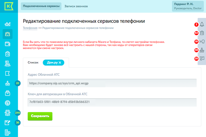 3. В настройках CRM зайдите в «Телефония» — «Подключенные сервисы». Нажмите «Добавить сервис» Введите адрес АТС и ключ для авторизации, нажмите «Сохранить».