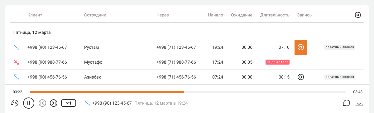 Кроме того, в истории можно прослушать записи звонков, заказанных через виджет обратного звонка с сайта.