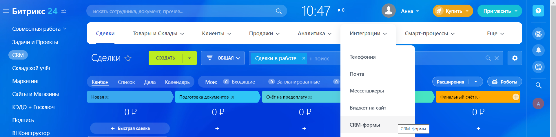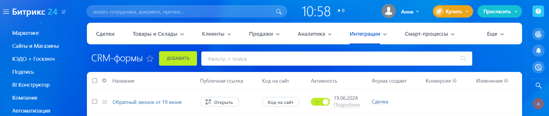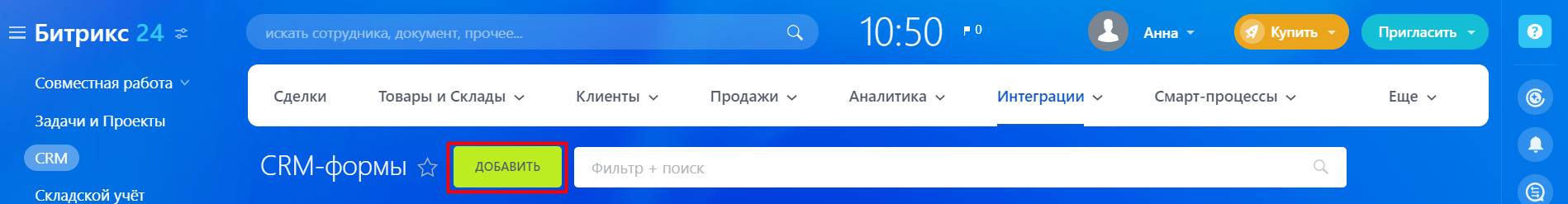 В Битрикс24 зайдите в раздел «CRM» – «Интеграции» – «CRM-формы».