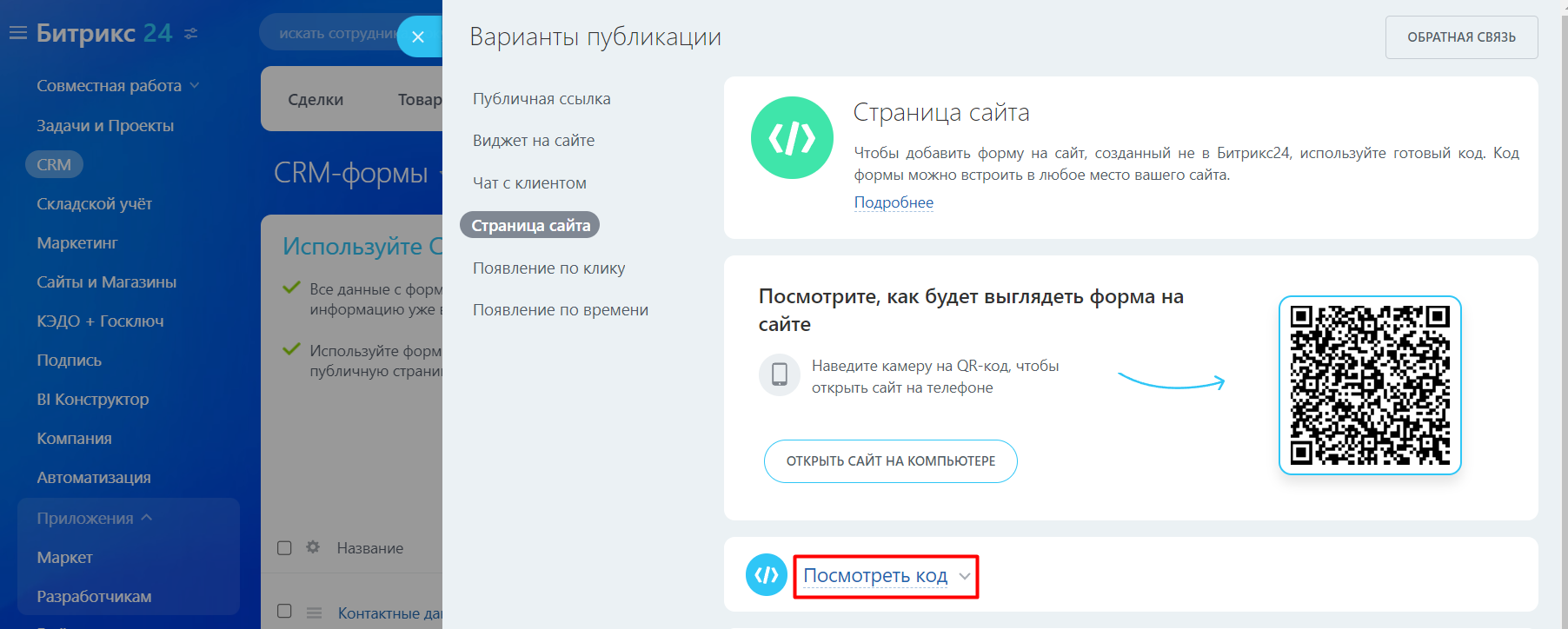 Для добавления формы на сайт, созданный не в Битрикс24, нажмите на кнопку «Код на сайт».