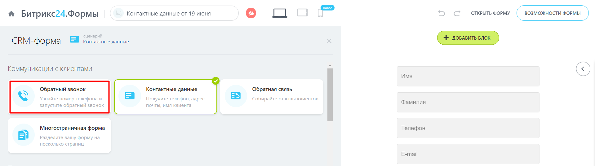 По умолчанию откроется CRM-форма «Контактные данные». Кликните на блок «Обратный звонок».