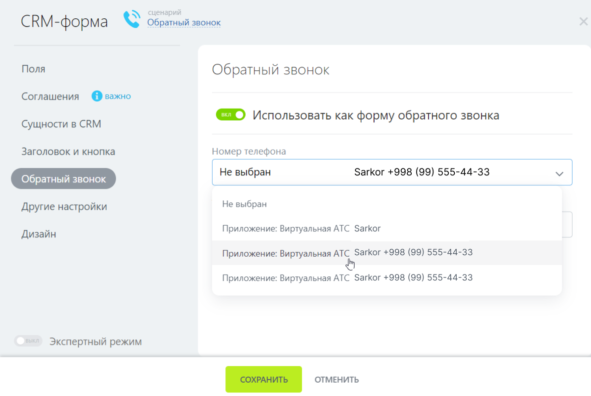Не забудьте нажать «Сохранить» в общем окне настройки обратного звонка.