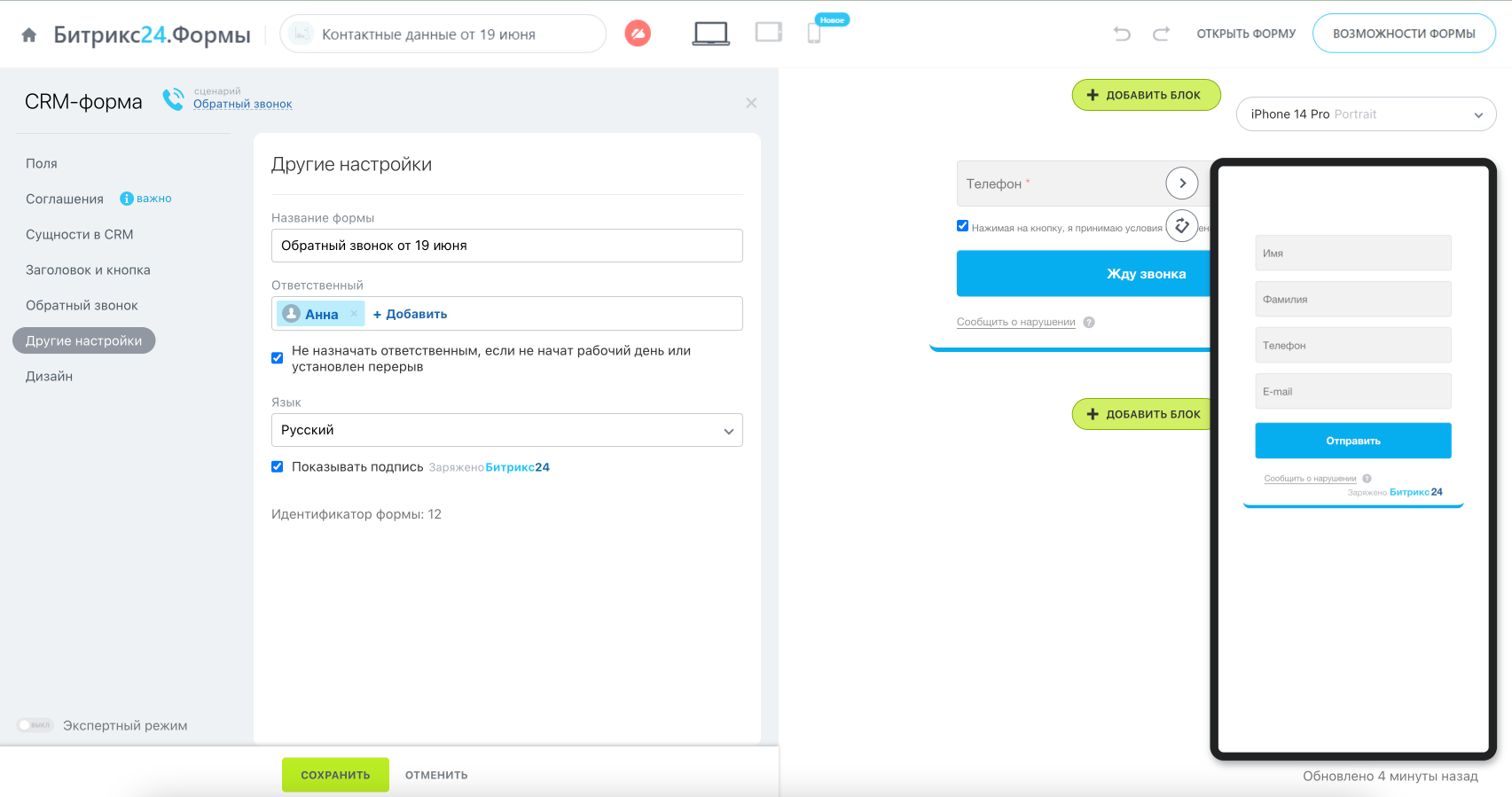Перейдите в раздел «Другие настройки». Выберите ответственного менеджера, которому будут поступать звонки от CRM по заявкам с этой формы.