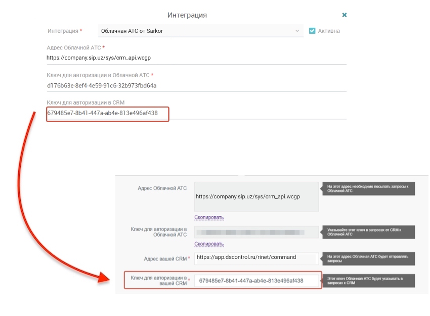 Вставьте скопированные данные в поля «Адрес Облачной ATC» и «Ключ для авторизации в Облачной АТС».