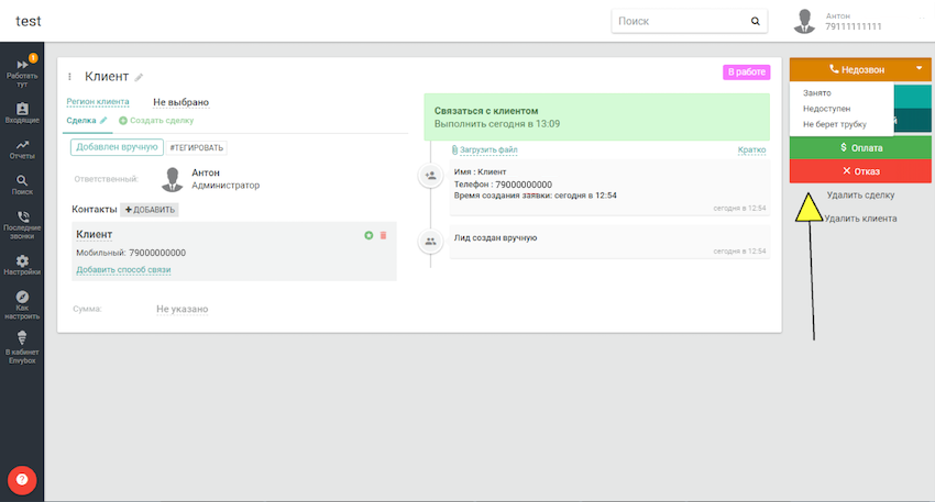 Если менеджер не дозвонился, жмет кнопку «Недозвон» и CRM сама ставит ему задачу перезвонить через 5 минут. Если менеджер не дозвонится снова — появится задача перезвонить через час. Далее — через сутки. Затем – еще через неделю. Если клиент так и не возьмет трубку, лид помечается как некачественный и перемещается в корзину.