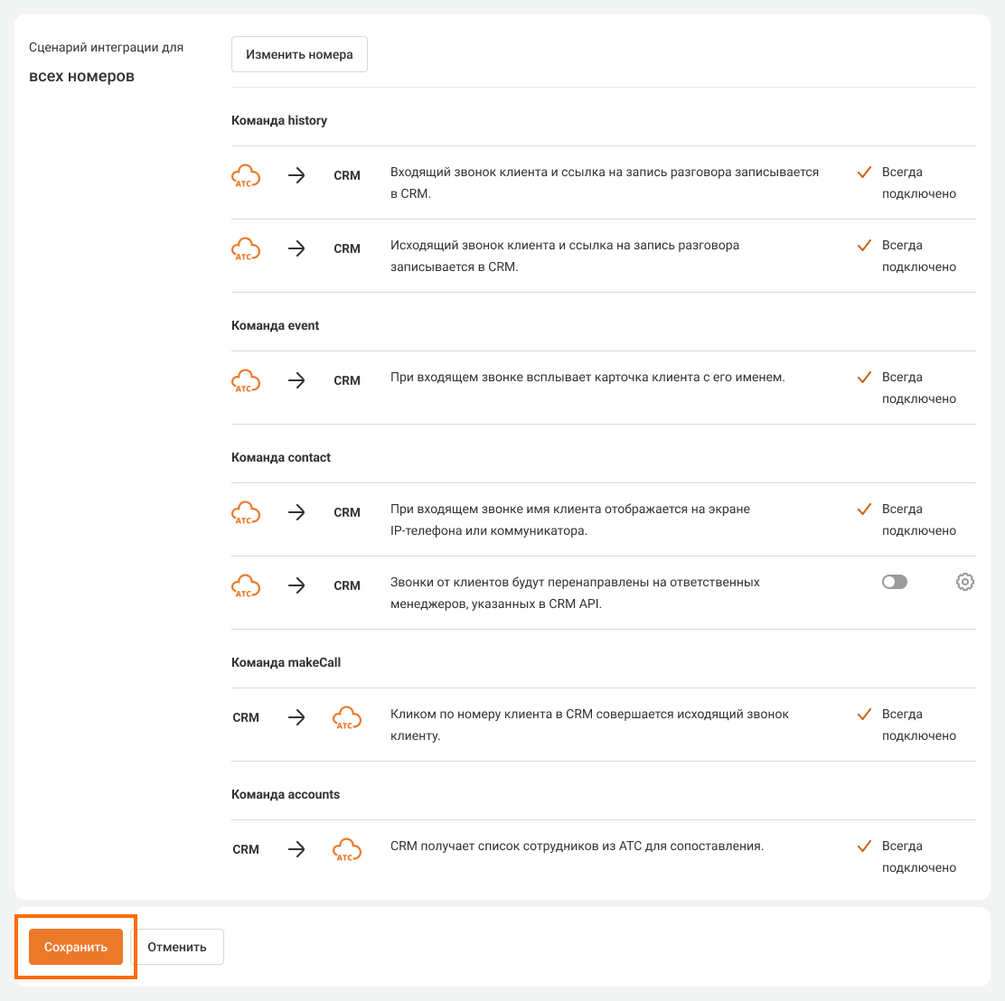Вернитесь в настройки CRM-системы, укажите внутренние номера сотрудников и нажмите кнопку «Сохранить». На этом интеграция с Облачной АТС будет завершена.