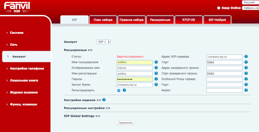 • Адрес SIP-сервера — имя вашей Облачной АТС.
