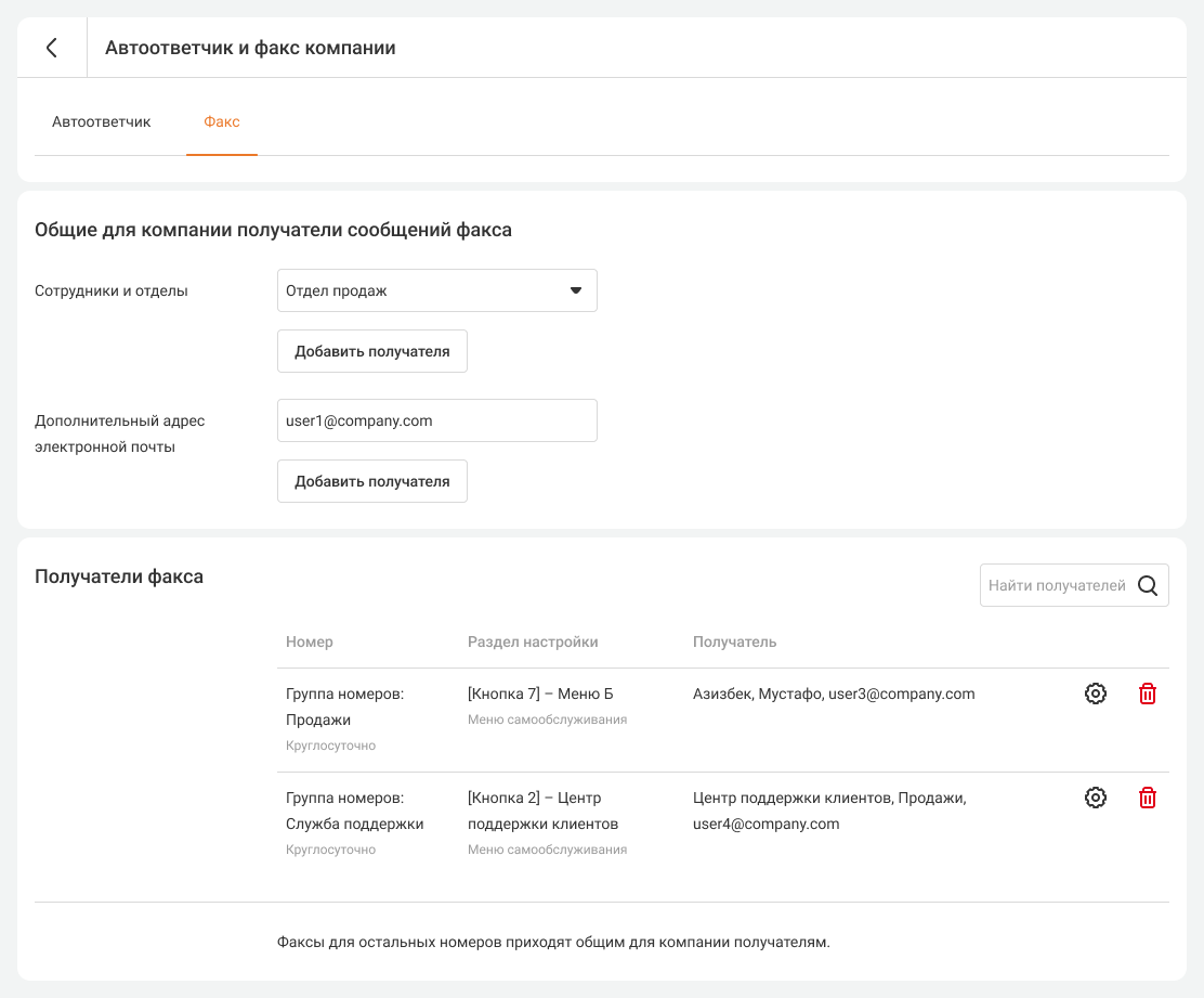 В этом разделе, помимо настроек общего факса компании, вы можете изменять получателей факса для выбранных номеров. Чтобы изменить настройки, кликните на шестеренку справа от выбранного номера. В открывшемся окне вы можете добавить или удалить получателей факса, а также указать дополнительные электронные адреса, куда будут отправляться факсы.