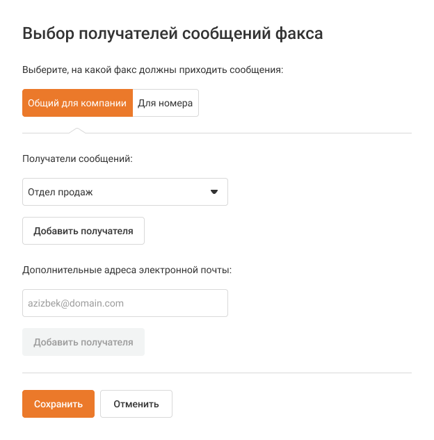 • Общий для компании — голосовые сообщения будут приходить всем получателям сообщений общего факса компании;