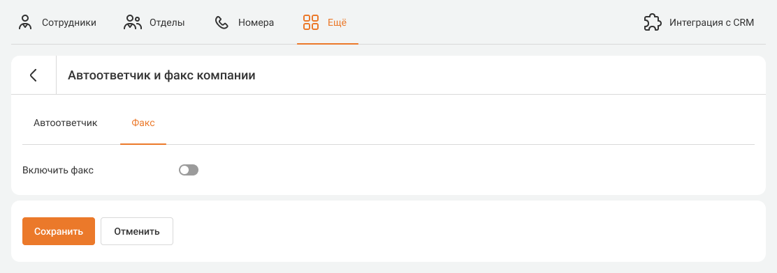 Чтобы посмотреть настройки всех факсов компании, перейдите в «Настройки» – «Еще» – «Автоответчик и факс компании» – вкладка «Факс».