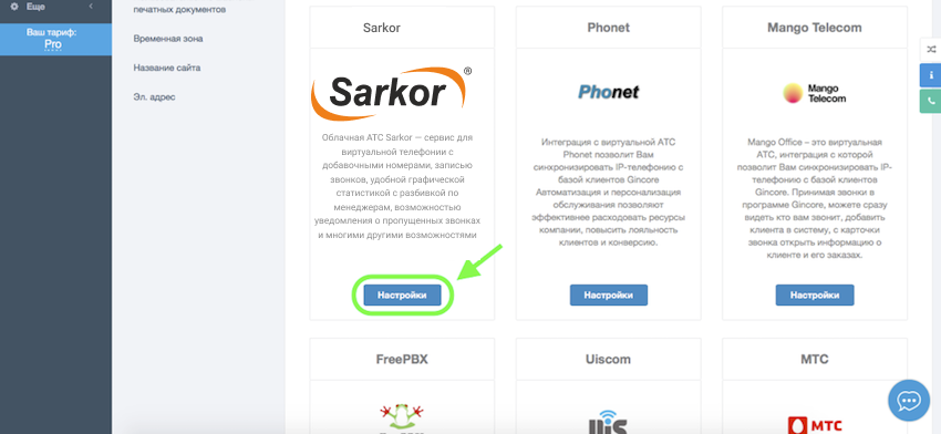 3. Зайдите в Gincore. Выберите «Еще» — «Настройки» — «Интеграция с телефонией». Нажмите кнопку «Настроить» на карточке Облачная АТС.