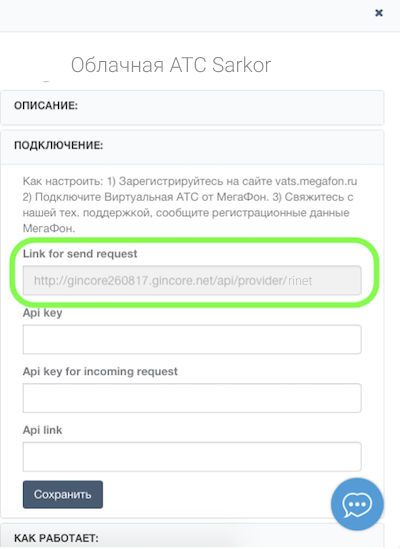 5. Скопируйте значения поля «Link for send request» (название вашего сервиса.gincore.net/api/provider/sip-uz).