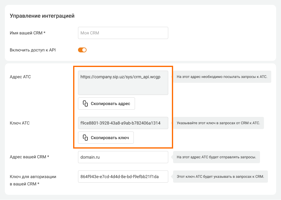 • Api key for incoming request — «Ключ для авторизации в вашей CRM».