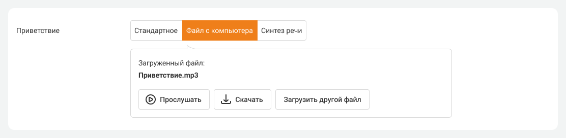 Вы можете заменить приветствие в любой момент, выбрав из ранее загруженных файлов или добавив новый. Также вам всегда доступно стандартное уведомление и возможность создать приветствие, преобразовав текстовое сообщение в речь (функция «Синтез речи»).
