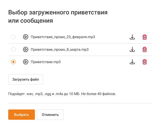 Если вы хотите включить его сразу, нажмите кнопку «Выбрать». Если пока вам нужно проигрывать другое приветствие, выберите его, поставив отметку слева от нужного файла.
